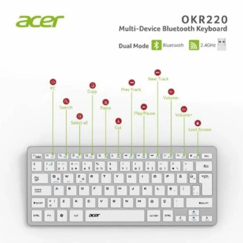 Acer OKR220 Beyaz MultiDevice Dual Mode 2.4 GHz & Bluetooth Kablosuz Klavye – Smart TV / Android Uyumlu