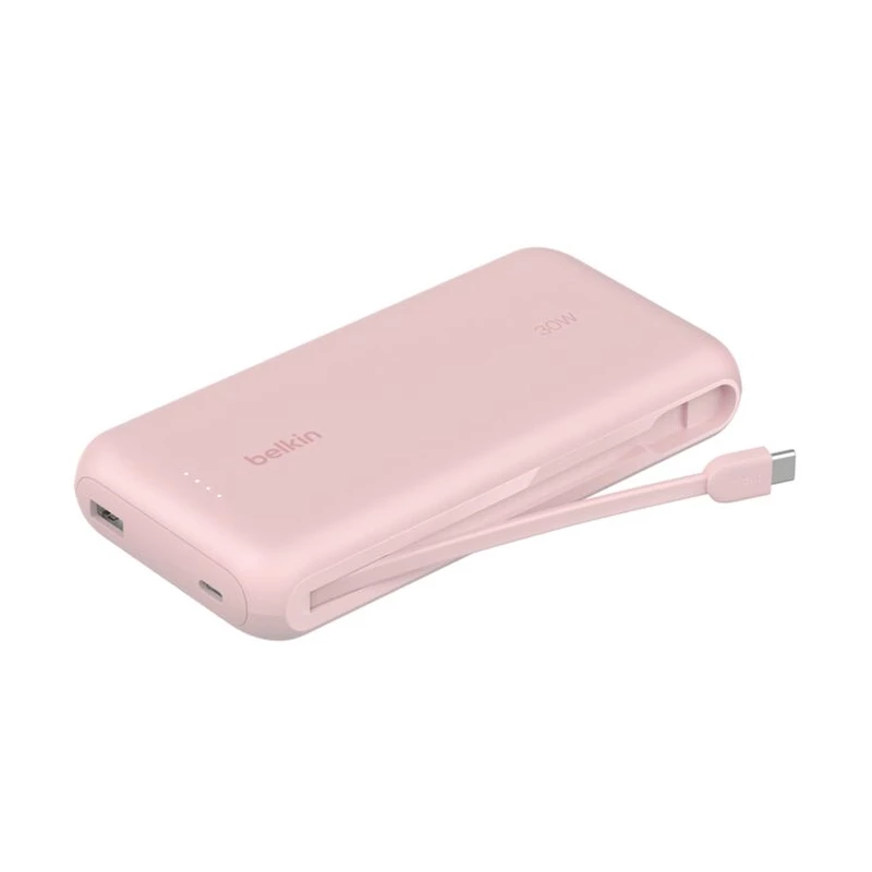 Belkin BoostCharge Power Bank Pembe 20K (BPB024), 20.000 mAh kapasite, 30 W Power Delivery hızlı şarj ve entegre USB-C kablo ile cihazlarınızı her durumda hızlıca besler.