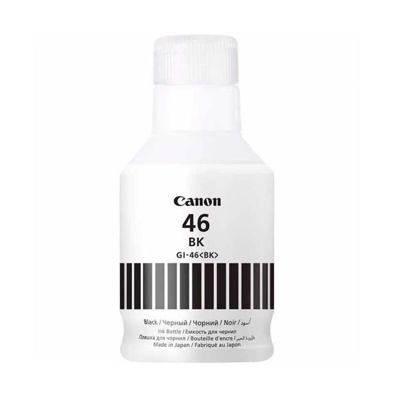 Canon GI-46BK siyah şişe mürekkep, Canon MegaTank / G-series yazıcılar için üretilmiş orijinal Canon siyah mürekkep şişesidir. Yüksek yoğunluklu siyah mürekkebi ile net, keskin ve okunaklı belgeler elde etmenizi sağlar. Büyük hacimli şişe tasarımı sayesinde daha uzun süre baskı yapma imkânı sunar ve dolum işlemleri kolayca yapılır. Orijinal Canon mürekkep formulü, baskı kafasını ve diğer hassas bileşenleri koruyarak uzun ömürlü ve stabil baskı performansı sağlar.
