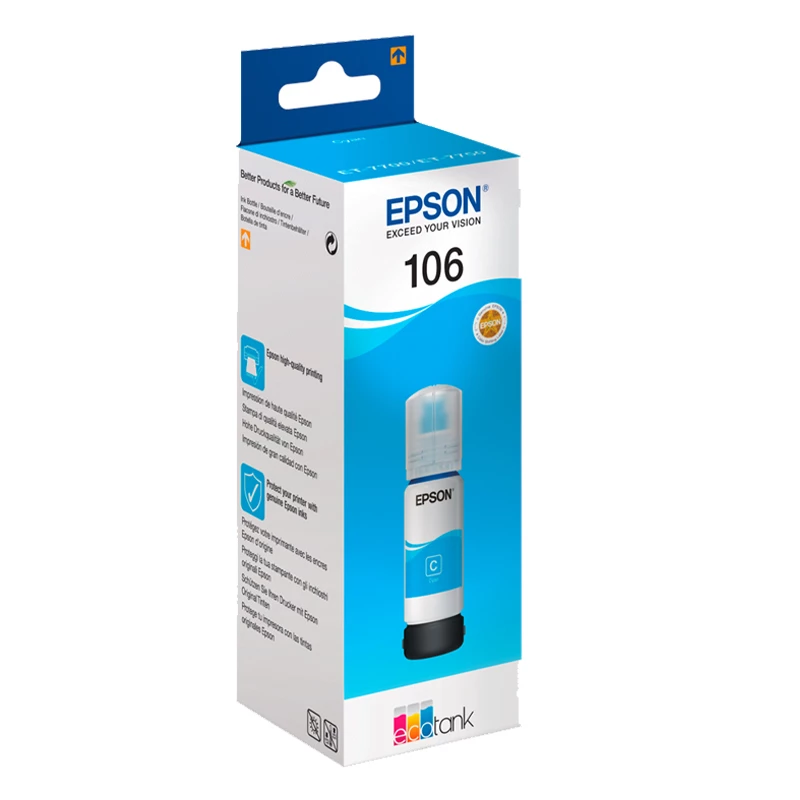 Kutu İçeriği: 1 x Epson 106 Cyan Mavi Şişe Mürekkep (T00R240)