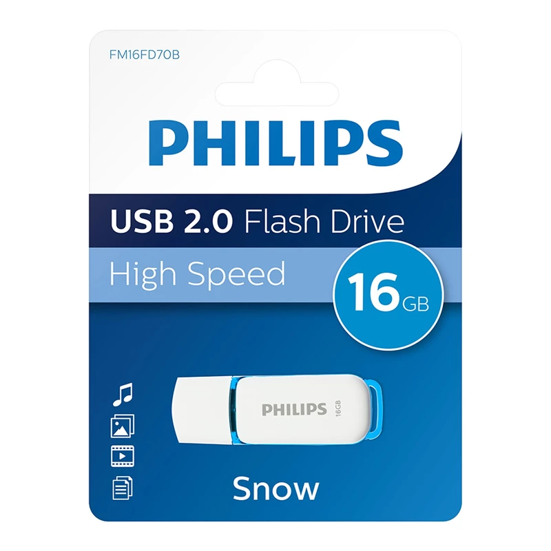 Philips 16GB Snow USB 2.0 bellek; kompakt tasarım, şık mavi/beyaz renk ve güvenilir depolama ile günlük veri taşıma için ideal çözümdür.