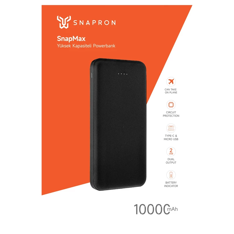 SnapMax SNP-3001 powerbank, 10000 mAh taşınabilir şarj cihazı, çift USB çıkışlı powerbank, Type-C girişli powerbank, hızlı şarj taşınabilir batarya, siyah powerbank
